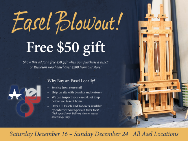 You can also get a free $50 gift when you purchase a BEST or Richeson Wood Easel worth over $200. Just show this ad.